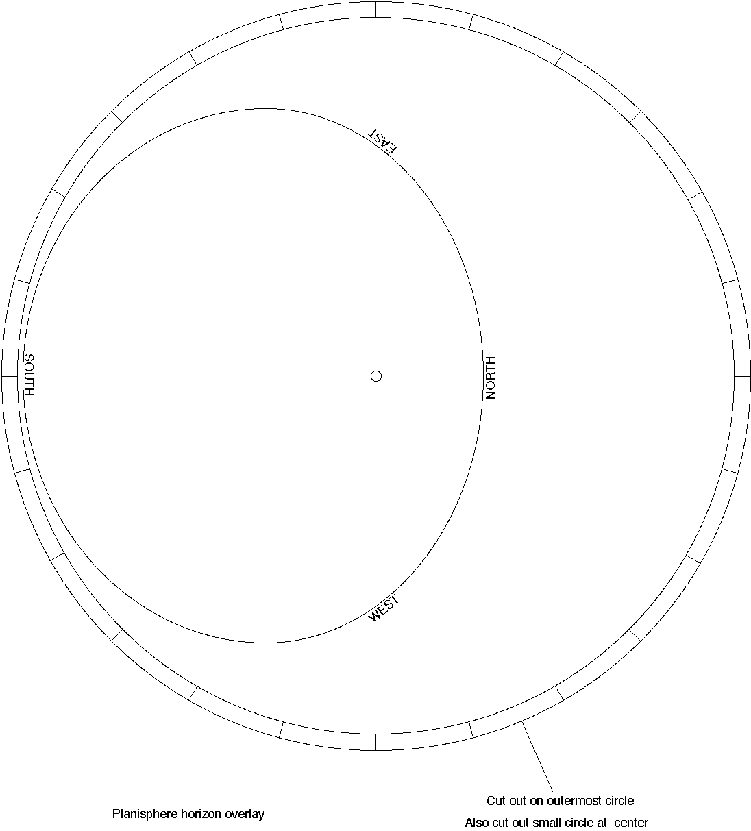 Again, the overlay on this page is too small to read. Click here for a larger overlay. This is scaled 2x oversize so you can print it half-size and fit it onto an 8.5" x 11" sheet of paper and still be able to read it. You will have to copy this onto transparency material at your local copy shop. The overlay outline should be a perfect circle. The second-largest circle should exactly match the outer circle of the planisphere chart. If it does not match, or it prints out as an oval, you'll have to rescale the chart with a graphics program. The third-largest "circle" really is an oval. Again, if you can't get a decent printout, send me a self-addressed envelope.