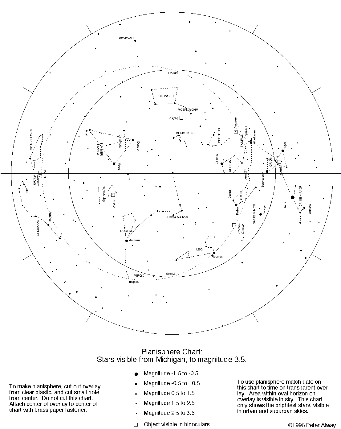 | The planisphere chart is a star chart centered on the north celestial pole (All you southern hemisphere web surfers, you'll need a chart centered on the south celestial pole--sorry, but I haven't drawn one up). It shows all the sky that is ever visible from Michigan. Only part of this chart is visible in the sky at any time. | ![]() |