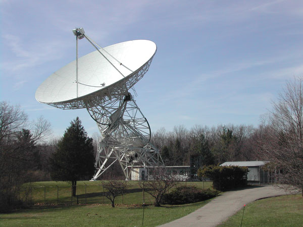 The photograph above shows another view of the 26 meter dish. The control building is easier to see in this photo. Note that the orientation of the dish is different in this photograph than it was in the previous photograph; the orientation changes over time so the telescope can image different targets. Unlike an optical telescope, a radio telescope can operate day or night and is not affected by clouds or rain.