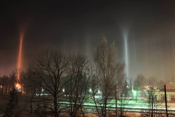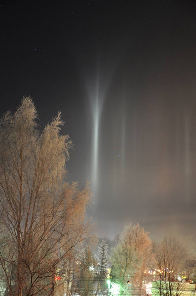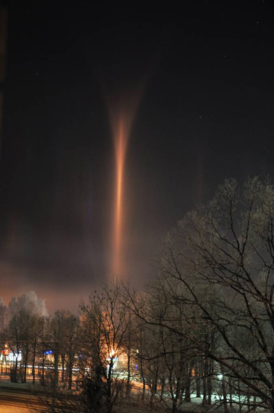 Unlike the crystals producing sun pillars, those making tall artificial light pillars need not be strongly tilted. The column producing pillars are approximately midway between the eye and the light source. The higher the crystals in the atmsphere, the taller is the pillar. When the crystals are very high—or the light sources are close—the pillars seem to radiate from overhead, the zenith.