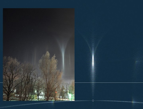 Now, there seemed to be some question as to why these “Light Pillars” fan out at the top and the answer (although slightly debated) is that toward the top of these pillars a different shaped crystal is more prevalent; this type is called a “horizontal column” crystal.