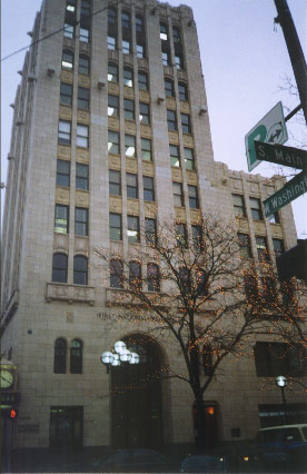 As one might easily assume, this building was a focal point immediately after its construction in 1929. The building was bathed in light from sixteen floodlights of 1000 watts making it a spectacle from miles away. The 1920s marked a prosperous time in Ann Arbor and this building symbolized the greatness of the times. It is considered to be the first skyscraper in Ann Arbor. Ann Arbor's First National Bank moved into the first floor of the building in 1929. The bank was known for its state of the art vaults and security system. Architect Paul Kasurin spared no expenses when designing the interior. In the early 20th century, the lobby of the building was described as, "finished with black terrazzo floor, black and gold marble base and trim, Italian travertine walls, bronze doorways and richly decorated coffered ceiling," (Reade & Wineberg). The exterior is just as spectacular. The terra cotta shell is characterized with strong vertical lines. Gargoyles are mounted directly underneath the roof of the building. Recently, the bank has had to share some of the first floor with retail companies. The building was purchased in 1981 by the First Martin Corporation. First Martin has since taken the time to restore the building to preserve its natural s plendor from the 1920s.
