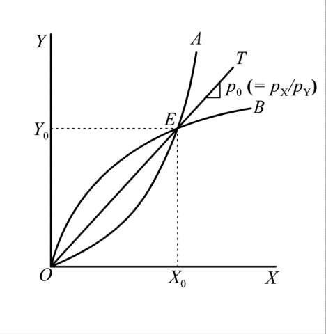 Offer curve OB is similarly defined for country B, except that the directions of trade for it are reversed. This is why it is something of a mirror image of OA. That is, it records quantities of good Y that B will export in exchange for various quantities of imports of good X. In equilibrium, of course, country B must import what A exports and vice versa, which is why equilibrium is found where the two curves intersect, at E.