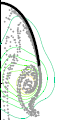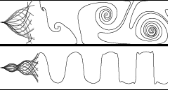 as an attracting state for a free flapping body PNAS, 2005, 102 (32), 11163-11166; S. Alben and M.J. Shelley. We study numerically a fluid flow problem at the transition between low and high Reynolds number locomotion, motivated by an experiment at the Courant Institute Applied Math Lab. In our study, a 2-D rigid body is flapped in the vertical direction and is free to move horizontally. Above a critical flapping frequency, the wing becomes unstable to horizontal motion. For certain ranges of wing shape and mass, this instability saturates to unidirectional flapping flight. We have found that the typical event which triggers "take-off" is a fortuitous collision of the body with vortices shed on previous flapping strokes. Dynamics of a free flapping body Take-off (.mov) Take-off (.avi) Back-and-forth (.mov) Back-and-forth (.avi) Chaotic (.mov) Chaotic (.avi) Thin body (.mov) Thin body (.avi) |