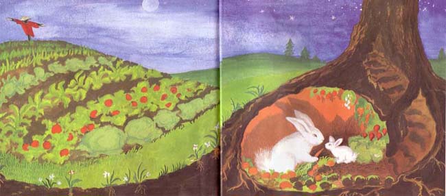 From Runaway Bunny, copyright Harper and Row, 1942. In this image, the final pages of Runaway Bunny, the bunny and his mother return to their home after many adventures through the imagination. Again, the gently rounded hillsides and warm greens, blues, and oranges represent a safe and stable place. In our story, the settings are generally smooth and are made up of light colors, generally green and blue. This is because the story is set in a fun but safe and comfortable world. Also, green and blue bring up images of nature and growth, positive and enjoyable thoughts. In addition, the smooth, round, green island can be contrasted with the jagged sea.