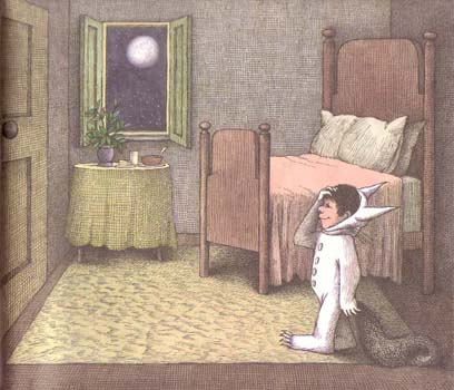 From Where the Wild Things Are, copyright Harper and Row, 1970. In this image, the final illustration from Where the Wild Things Are, Max has just returned home from the "where the wild things are." The floor and the bed are flat and comforting and the colors are peaceful yellows and pinks. Sendak has chosen these scheme to bring Max from a wild place to his home, a safe haven where he can eat his supper and go to bed.