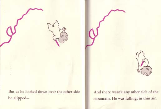 From Harold and the Purple Crayon, copyright Harper Collins, 1955. On the following page, we see the direct result. Although Johnson has chosen a basic color scheme of only black, white, and purple for his book, he can still use the vertical theme to bring action and enrgy into his work. As stated above, a height evokes images of kinetic energy and potential energy. In this scene. Harold uses energy to climb the mountain and the potential energy is realized when he falls from the summit.