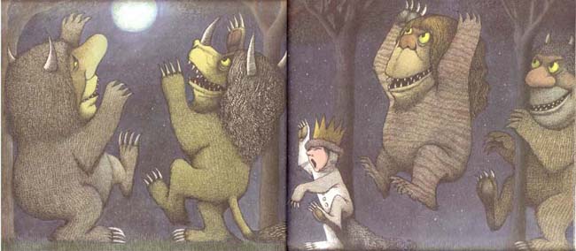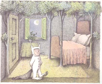 From Where the Wild Things Are, copyright Harper and Row, 1970. In this image from Where the Wild Things Are, Sendak shows the room changing as the action steps up. The trees growing in the room show the raising level of adventure and energy.