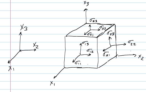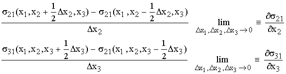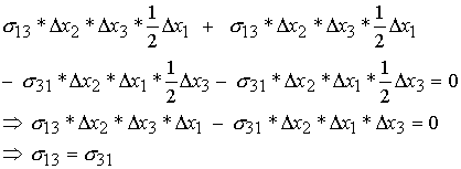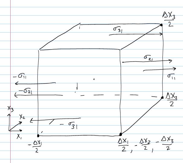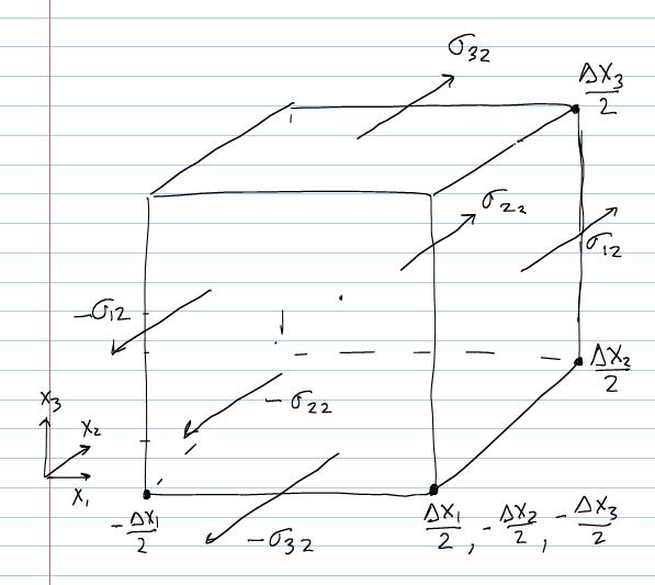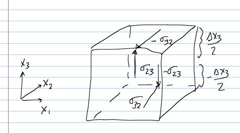 where the first two delta x terms are the area of the plane and the last term is the moment arm. We can now balance the moments in the x2 plane due to these shear stresses. It is important to note that on the innfinitesimal cube there are no externally applied moments (there are some continuum theories that assume moments at this level, but they are not widely used and are beyond the scope of these notes). Thus the balance of moments in the x2 direction leads to: