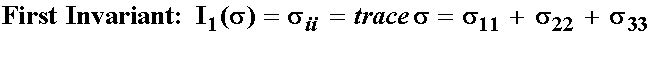 Now that we have defined stress as a second order tensor, and the equilibrium equations governing stress, we will look briefly at the stress tensor invariants. Recall that second order tensors such as the Cauchy Stress tensor will change value when referenced to different coordinate systems. Invariants are scalar functions of tensors that by definition have the same value no matter the coordinate system to which they are referenced. It is important to understand stress invariants since they will play a role in developing constitutive equations, especially for soft tissues that are often assumed to be incompressible. Recall from section 1 the general definition of invariants for a second order tensor. If we simply replace the A notation for a second order tensor with the s for the Cauchy stress tensor, then we have: