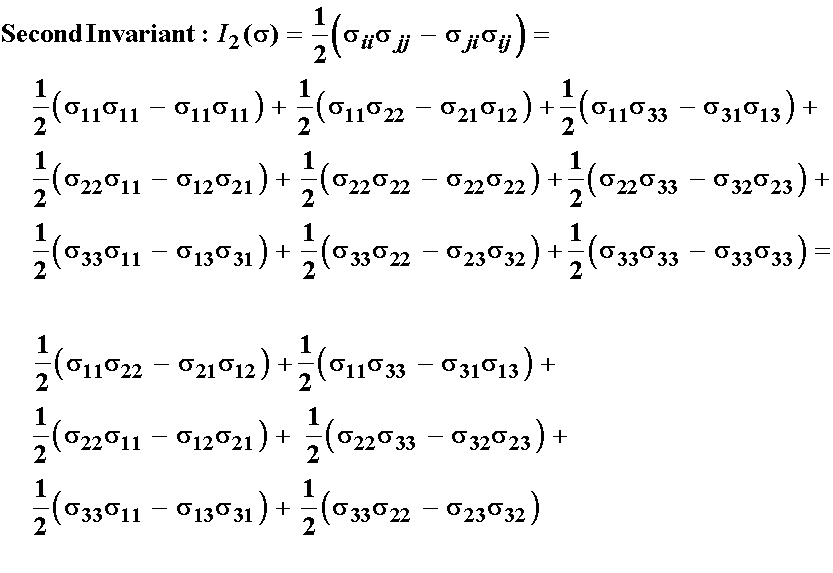 As mentioned, the stress tensor invariants have physical meaning. The first invariant is the hydrostatic stress or pressure. This plays an important role in tissues that are assumed to be incompressible. Incompressibility means that no matter how high the hydrostatic pressure, it will not cause a volumetric deformation. The second invariant is related to shear stress. In fact, the octahedral shear stress is computed from the second invariant as: