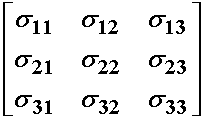 When the material cube shown above is shrunk to an infinitesimal point, then three components of each of the traction vectors on the cube face become the nine components of a second order stress tensor. It is important to note that this stress tensor is always defined in the deformed state of the material, and is known as the Cauchy stress tensor. This definition will become important when we deal with small versus large deformation mechanics. The 2nd order Cauchy stress tensor may be written in matrix form as: