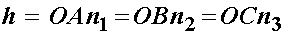 We can also see that the altitude of the tetrahedral, ON with length h, is a leg of each of the three right triangles ANO, BNO, and CNO, with hypotenuses OA, OB, OC. Thus, the length h can also be written as: