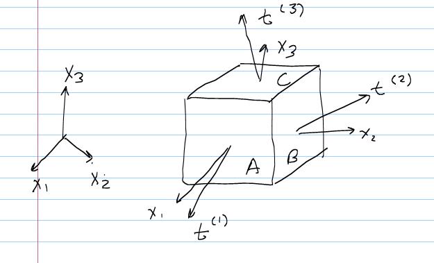 At this point we note that the three components of the traction vector on the orthogonal surfaces are essentially equivalent to the 2nd order stress tensor as the tetrahedron is shrunk to a point. Thus, we can write the three components of the three traction vectors as components of the nine element 2nd order stress tensor and re-write the balance of force equations as (placing the stress tensor components on the right hand side of the equation):