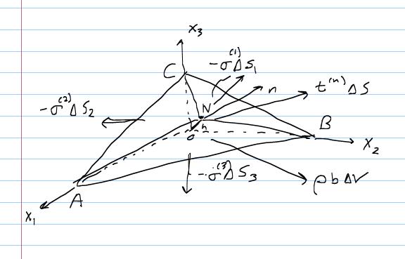 Now, since we are operating under a continuum assumption, we will assume that we can shrink the tetrahedron to a point, and that the material contained within the tetrahedron will remain homogenous. Also, since the traction vectors s and t represent average forces over the face areas, there averages will converge to a single value as the volume of the tetrahedron shrinks to zero. Thus, in the limit, the base areas and the height of the tetrahedron will approache zero. Any terms multiplied by the height or base area will become zero in the limit. In the above equations, the body force terms become zero as we shrink the tetrahedron. This leaves the following: