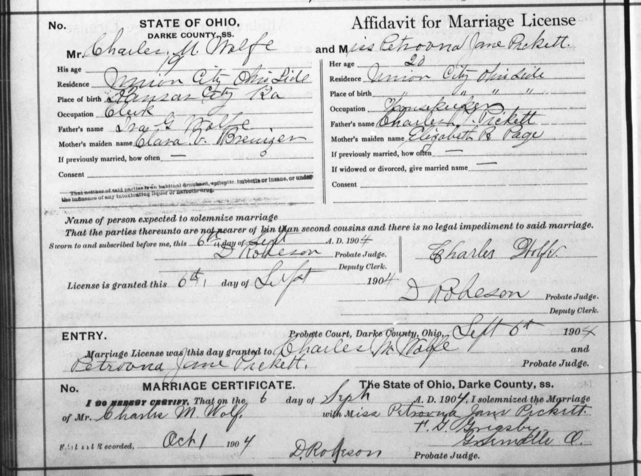 1904 Petrovna Pickett and Charles Wolfe were married on September 6, 1904, in Darke County, Ohio, by H.G. Grigsby. [7] [8] [9]
