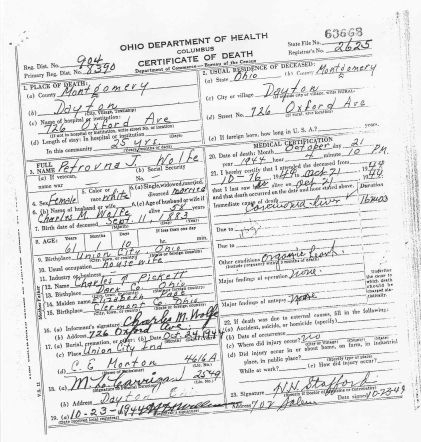 1944 Petrovna J. Wolfe died on October 21, at her home at 726 Oxford Ave, Dayton, Ohio. Her parents Charles T. Pickett and Elizabeth Page were named on her death certificate. She died of liver cancer. [81] [Photocopy, 1944 Petrovna Wolfe's death certificate.] [82]