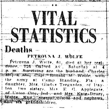 Petrovna J Wolfe died at her residence 726 Oxford Av. Saturday at 4pm. Surviving are the husband Charles M.; a son Capt. Ranald M Wolfe with the army at Camp Blanding, Fla; a daughter Mrs. Gladys Teegarden of Dayton; two sisters Mrs. E. G. Applegate of Union City, Ind and Mrs. Kate Drury, Weeds, Kansas; several nieces and nephews and six grandchildren.