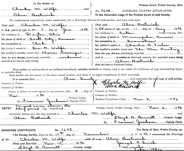 1946 Charles M Wolfe and Alva Fisher Bostick were married on November 14. The license reported that Charles M Wolfe was widowed, born in Scott County Kansas, son of Ira G Wolfe and Clara Brenizer, and that Alva Fisher Bostick was divorced, daughter of Charles Fisher and Ida Bunting. [photocopy, 1946 Marriage certificate, Preble County Library.] [91]