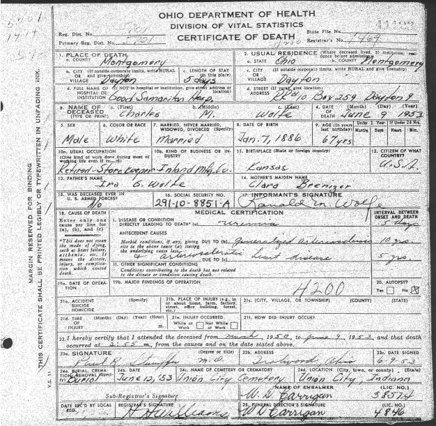1953 Charles Wolfe died at the Good Samaritan Hospital, with residence at address RR#10, Box 259, Dayton, Ohio. He died of uremia with arteriosclerosis as the underlying cause. His occupation was listed as retired-Storekeeper Inland Mfg. Co. [Photocopy, Charles Wolfe's death certificate.] [94]