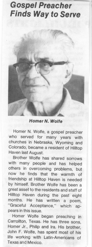 Homer N. Wolfe, a gospel preacher who served for many years with churches in Nebraska, Wyoming, and Colorado … Brother Wolfe has shared sorrows with many people and has helped others with overcoming problems … He has written a poem 'Grateful Acceptance' which appears in this issue. Homer Wolfe began preaching in Carrollton, Texas. He has three sons, Homer Jr., Phillip and Ira. His brother, John F. Wolfe, has spent most of his life working with Latin-Americans of Texas and Mexico.