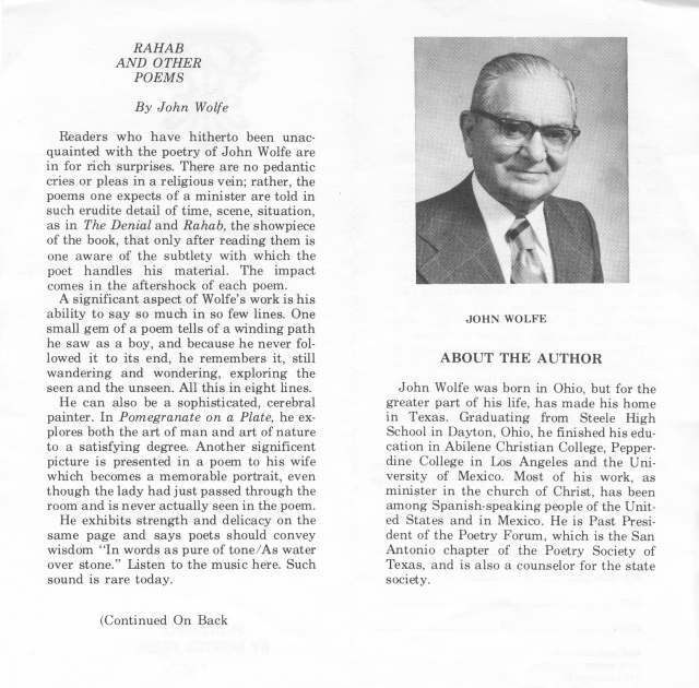 John was a minister in San Antonio, Texas. John was a poet and published several books of poems, one entitled "Rahab and other Poems". The cover of this book has the following synopsis. "John Wolfe was born in Ohio, but for the greater part of his life, has made his home in Texas. Graduating from Steele High School in Dayton, Ohio, he finished his education in Abilene Christian College, Pepperdine College in Los Angeles and the University of New Mexico. Most of his work as minister in the Church of Christ, has been among Spanish speaking people of the United States and in Mexico. He is past president of the Poetry Forum, which is the San Antonio chapter of the Poet Society of Texas, and is also a counselor for the state society." The book includes the following poem.