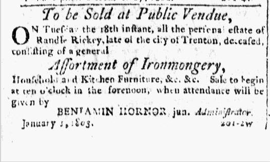 1803 The estate sale of Randle Rickey was announced in the Trenton Federalist on January 3. [Photocopy, Newspaper Notice.]
