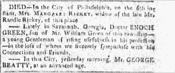 1807 The death of Margaret was announced in theTrenton Federalist. [Photocopy, Newspaper Notice.] [10]