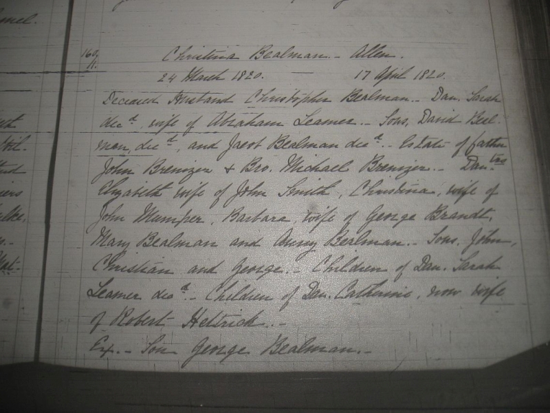 1820 Christina Bealman's will in Allen Twp, Cumberland County, Pennsylvania was dated March 24, 1820 and was proved April 17, 1820. It specified grave markers for deceased husband Christopher Bealman, daughter Sarah late wife of Abraham Leamer, son David Bealman, and son Jacob Bealman. Money from estates of father John Brenizer and brother Michael Brenizer. Daughters Elizabeth wife of John Smith, Christina wife of John Mumper, Barbara wife of George Brandt, Mary Bealman and Anny Bealman. Sons John, Christian and George. Children of Daughter Sarah Leamer deceased. Children of Daughter Catharine now wife of Robert Hettrick. Executor son George Bealman. [16] [17] https://www.ancestry.com/discoveryui-content/view/932004:8802 [Photocopy, Christina Beelman will abstract, 1820, Cumberland County, Pennsylvania.]