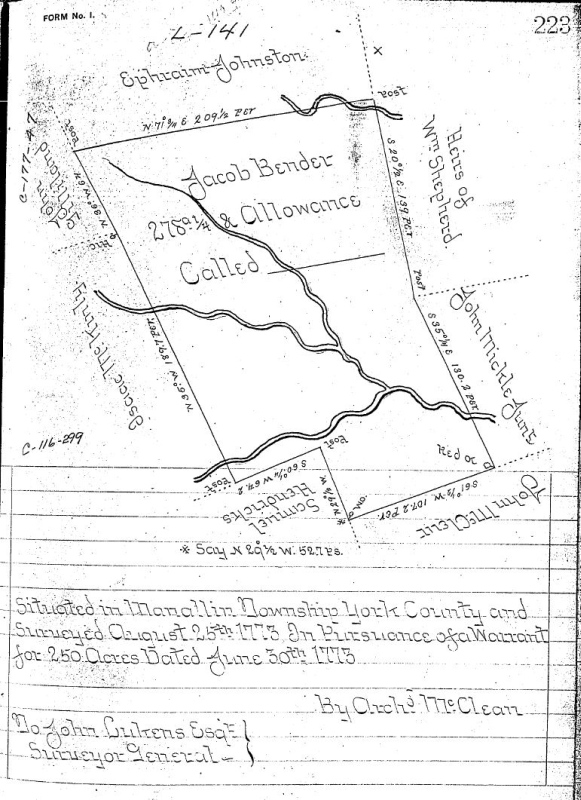 1773 Jacob Bender received a warrant for 250 acres in Menallen Twp, York County, Pennsylvania on June 30. [6] [7] A patent was granted, on September 18, 1809, to Henry Bender, perhaps Jacob's son [8]. The survey map showed adjacent lands owned by Ephraim Johnston [9] [10], heirs of Wm Shepherd, John Mickle Jr, John McCleur, Samuel Hendricks, Isaac McKinley [11] [12], and John Gililand [13] [14]. There was an unnamed creek shown on the land.