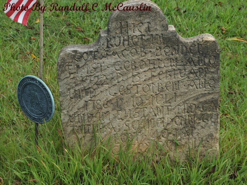 Here rests in God, Jacob Bender, [he was] born in the year 1722 on February 13 and died in the year 1786, the 10 of July and was ? with Catharine Schneider …