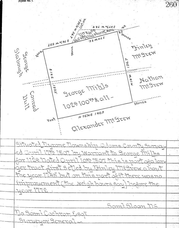 1807 George Mihls warranted 112 acres in Liberty, Tyrone Twp, Adams County, Pennsylvania, on April 10. Adjacent landowners were Conrad Dull, George Slabough, Finley McGrew, Nathan McGrew, and Alexander McGrew. [26] [27] [28] [29] [30] [31] [32] [Photocopy, Survey for George Meals.]