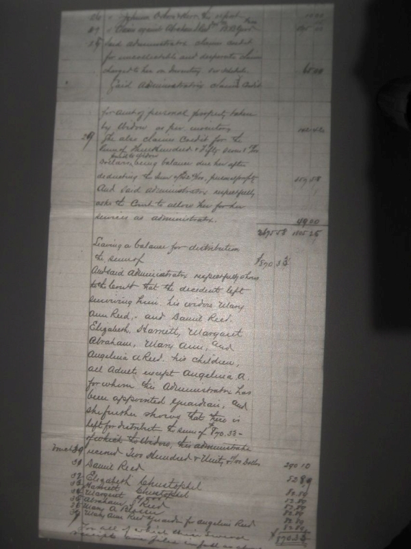 1874 William S Reed died on May 18 and was buried at Bull Cemetery, Elkhart County, Indiana. William S Reed was born on August 21, 1798. [92] [93] [94] [95] His estate was administered by his second wife Mary Ann, who marked all papers with an X. The estate named 7 children: Daniel Reed, Elizabeth Christophel, Harriet Christophel, Margaret Good, Abraham J Reed, Mary A Blosser, and minor child Angeline Reed. Each child received $82.89. A note to B.B. Good (son-in-law) was mentioned. Accounts were settled with John M Christophel, John N. Christophel, and Peter Blosser (all sons-in-law). [Photocopy, FHL film 1711410, William Reed Estate settlement.]