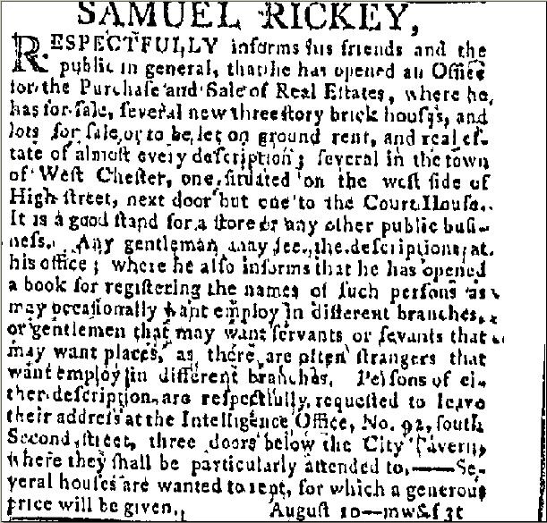 1795 Samuel Rickey announced opening a real estate service with houses for sale in West Chester in the Philadelphia Gazette (August 12). [Photocopy] Newspaper Notice.