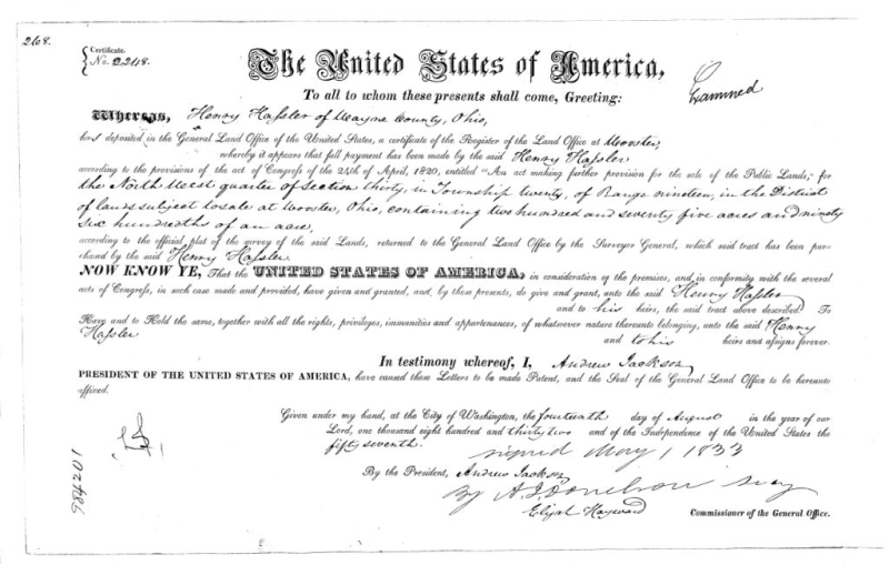 1832 President Andrew Jackson granted land to Henry Hosler, perhaps not this one [age 15?], in Morrow County, Ohio. [Photocopy] 1832 Grant to Henry Hosler by President Andrew Jackson.