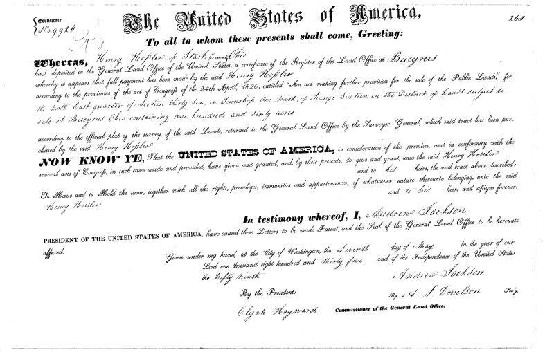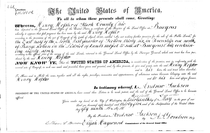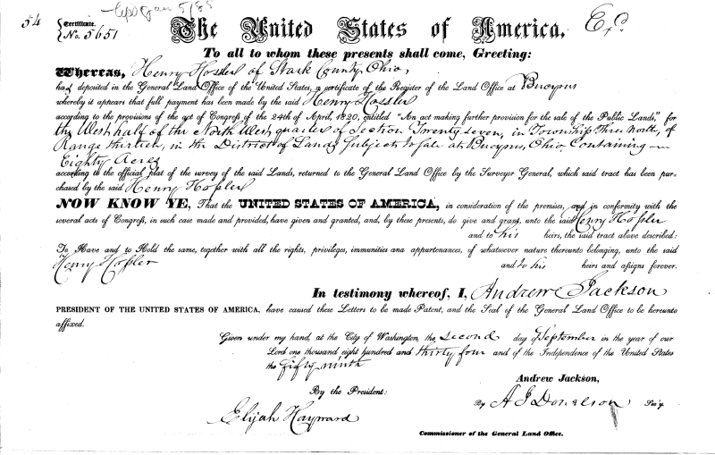 1835 Henry Hossler of Stark County, Ohio, perhaps not this one [age 18?], was granted land in Ohio, section 36, township 1 north, range 16 by President Andrew Jackson. [Photocopy] and [Photocopy] 1835 Ohio land grants for Henry Hosler.