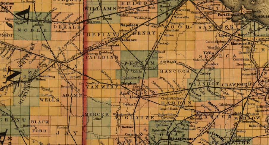 [38] George Woolworth Colton, Colton's county & township rail road map of Ohio, Indiana, & Michigan, with parts of adjoining states & Canada; printed by Lang & Laing, 1859 (1859), [LibraryOfCongress Map], [LibraryOfCongress Catalog].