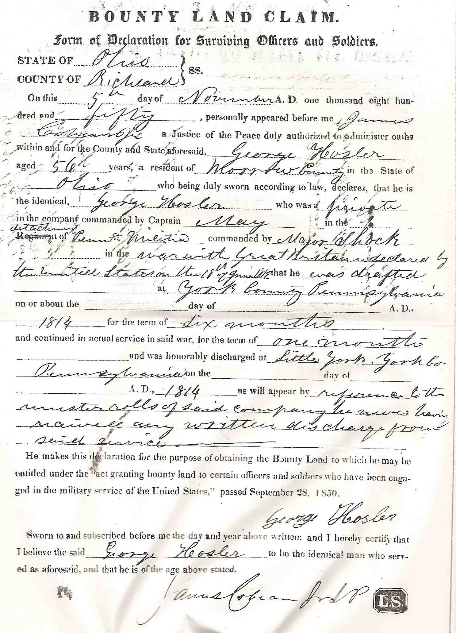 On November 5, 1850, at Richland County, Ohio, George Hosler, age 56, of Morrow County, Ohio, filed a Bounty Land Claim as a surviving officer. He declared that he was the same George Hosler who was a Private in the company commanded by Captain May in the detachment of the Pennsylvania militia commanded by Major Shock in the War of 1812 and that he was drafted at York County Pennsylvania in 1814 for a term of 6 months and was honorably discharged at Little York, York County. After being initially rejected for lack of written discharge papers, the claim was finally granted.