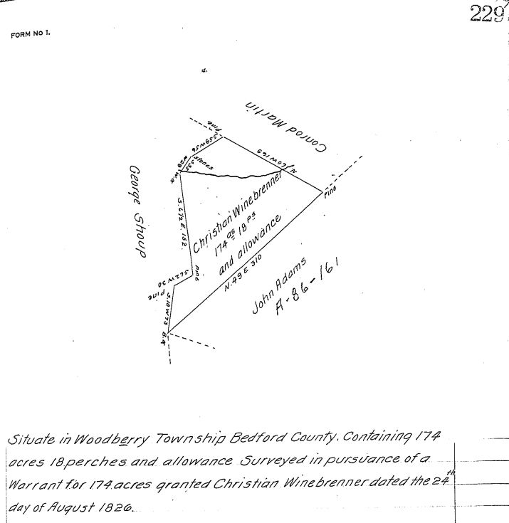 1826 Christian Winebrenner warranted 174 acres in Woodbury Twp, Bedford County, Pennsylvania on August 24, with date of return April 16, 1828. [Photocopy, 1826 Survey map of Christian Winebrenner patent.] The land was shown on earlier surveys as land of John Adams. [105] [106] [107] [108]