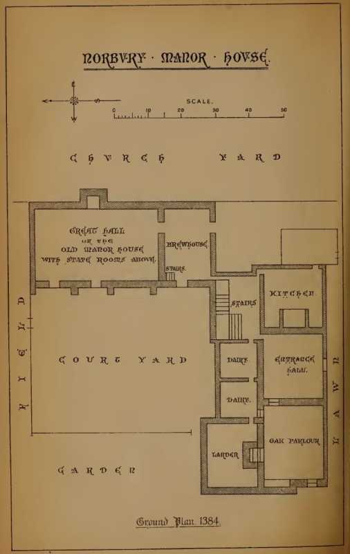 "Sir Henry Fitzherbert, fifth lord of Norbury, who came into his inheritance in 1267, married the daughter of Ralph Chaddesden. He was living in 1310, but the exact date of his death is not known. His stone effigy, in chain armour, occupies the centre of the chancel of Norbury church.* Towards the end of his life he rebuilt the Manor House in stone on a large scale, consisting of two courts. Previous to this, it had probably been throughout a timbered or half-timbered dwelling. The court of the original Manor House was sufficiently spacious to permit of the high-road from Yeaveley to Ellaston passing through the centre. This road from the Preceptory of the Knights Hospitallers at Yeaveley, crossing the Dove just below the Manor House of Norbury, by a ferry and also by a foot and packhorse bridge, and leading to several Staffordshire Abbeys of importance, would be one of considerable traffic for a country district, and we are not surprised to find that Sir Henry Fitzherbert sought to close or divert the road before beginning the enlargement of his house. An Inquisition was held in 1301 to decide on the expediency of permitting the closing of this road, and the jury reported favourably;X but it was not till four years later that he obtained the royal license to effect this, on payment of forty shillings, and on condition of making another road through his own lands equally commodious for travellers. The road that he then made was probably the one now used, which turns off to the west just in front of the Manor House, and closely skirts it." [1] [Photocopy, 1384 schematic of Norbury Manor House.] [2]