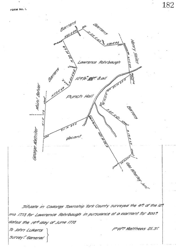 1773 Lawrence Rohrbach received a warrant, dated June 14, for 200 acres in Codorus Twp, York County. The tract was named "Punch Hall". [14] [15] A survey of the tract, dated December 4, reported 159 acres and showed adjacent tracts of land belonging to George Kaltriter, Michael Behler, Henry Skiles, and George Wherley Jr. [16] [Photocopy, Survey of Lorentz Rohrbach's "Punch Hall" property in York County, Pennsylvania, 1772.] Lawrence Rhobaugh received a patent for the land on November 9, 1784. [17]