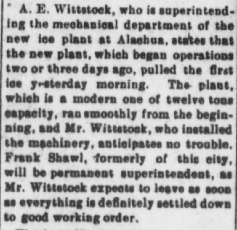 1905 Frank Shawl was appointed superintendant of a new ice plant at Alachua County, Florida. [Photocopy, Newspaper notice.]