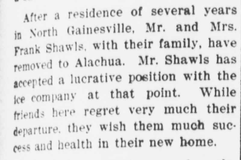1907 "After a residence of several years in North Gainesville, Mr and Mrs. Frank Shawl with their family, have removed to Alachua. Mr Shawl has accepted a lucrative position with the ice company at that point." (Frank Shawl was Clara Brenizer's brother-in-law)[12] [Photocopy, Newspaper notice.]