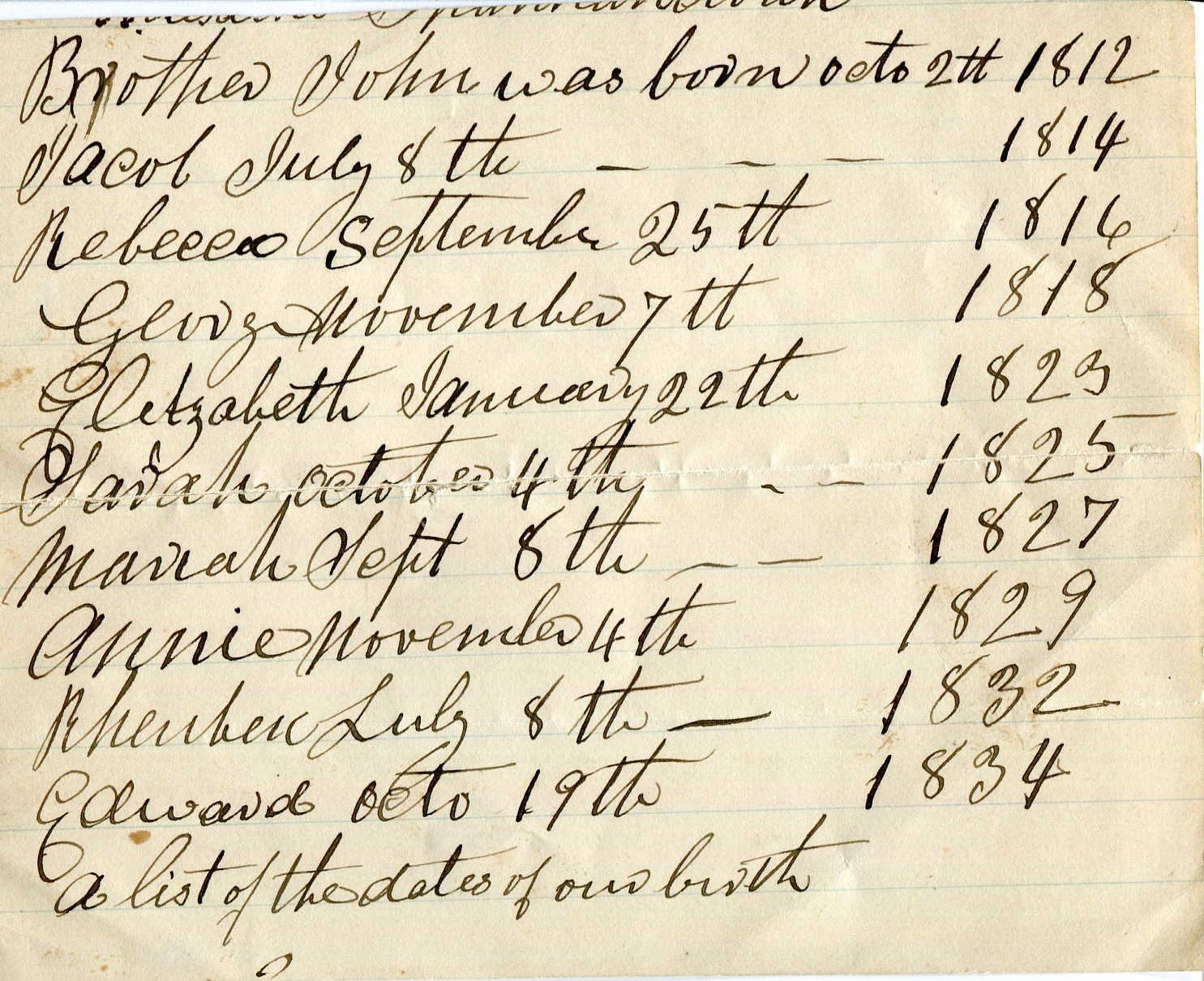 Grandfather's Second Family: John born Oct 2nd 1812, died 1885 age 73 yrs; Page 2 - Jacob born July 8 1814 died 1891, age 77 yrs; Rebecca Frederick b. Sept 28 1816 - died 1894 age 78 years; George b. Nov 7th 1818 d 1901 - 88 yrs; Elizabeth Youndt b Jan 22 1823 died 1893 age 70 yrs; Sarah Mellinger b. Oct 4 1825 died 1875 age 50 yrs; Maria Sponsler b Sept 8 1827 died Aug 7th 1913; Annie Wills b Nov 4 1829 died July 28 1912 age 82 7 mo; Reuben born July 28 1832 d 1912 age 79 yrs; Edward born Oct 19 1837 died Jan 11th 1914.