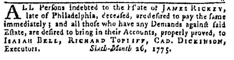 All Persons indebted to the Estate of James Rickey, late of this city, deceased, are once more requested to make speedy payment, otherwise they will be proceeded against as the law directs; and those who have any demands against said estate, are desired to bring in their Accounts, that they may be adjusted and paid by Isaiah Bell, Richard Topliff, Cadwalader Dickinson, Executors.