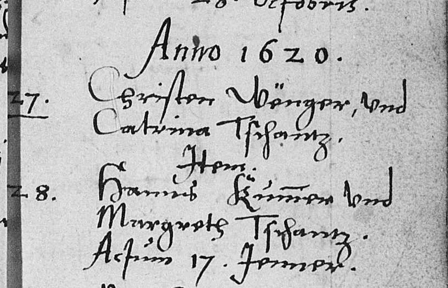 1620 Christian Wënger married Catrina Tschantz and Hanns Kummer married Margreth Tschantz in a double wedding on January 17, at Röthenbach, Bern, Switzerland. [3]