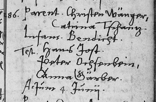 1624 Benedicht, son of Christian Wenger and Catrina Tschantz was baptized on June 4, with sponsors Hans Jost, Peter Ochfenbein and Anna Gärber. [8]