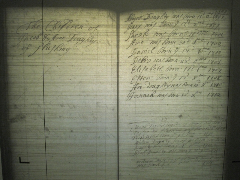 1713 "Ann Doughty, daughter of Jacob Doughty of flushing dyed ye 13d ye 2 mo 1713." [28]