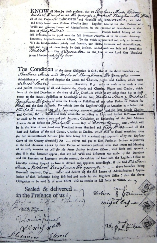 1752 Widow Barbara Stoner and Michael Baughman the elder and Michael Baughman the younger made bond for the estate of Jacob Stoner. Each signed with their mark. Dated December 30. [Photocopy, 1752 bond Jacob Stoner.]