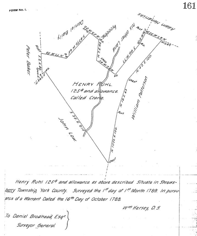 1788 Henry Ruhl received a warrant for a tract of 130 acres in Shrewsbury Twp, York County, Pennsylvania on October 18. [21] The land was adjacent to lands of William Patterson, John Low, Peter Becker, Daniel Bailey, Joshua Low, and Adam Hendricks. Interest to commence from October 1, 1773. There had been improvement on the land for about 15 years. [22] [23] A survey dated January 1, 1789 showed the tract named Crane and owned by Henry Ruhl. A stream on the tract went to his other land, which is the tract re-surveyed in 1800, based on the shape of the tract and adjacent landowners. Adjacent tracts were owned by William Patterson, John and Joshua Low, Peter Baker, Daniel Bailey, and Adam Hendricks. [24] [25] A patent for the tract was awarded to Henry Ruhl on May 30, 1810. [26] The 1800 census entry for Henry Ruhl also had nearby listings for James Patterson, John Law, and Daniel Bailey. [Photocopy, 1788 survey of Crane.]
